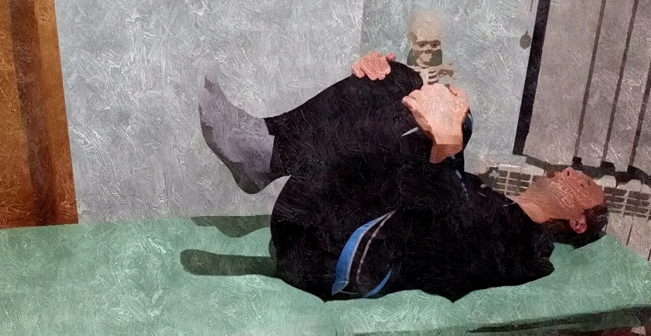 Tumbados de cubito supino con las piernas flexionadas y la planta de los pies apoyadas totalmente en el suelo cruzamos los brazos sobre el pecho