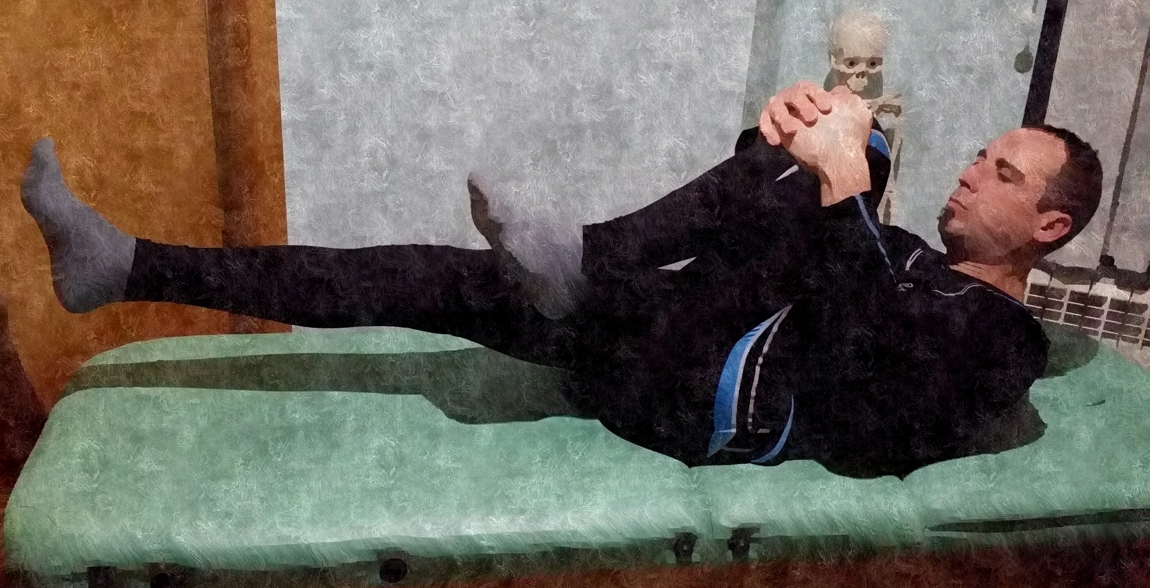 En posición de cubito supino tumbados flexionaremos la cadera y las rodillas llevando estas ultimas a la altura del abdomen agarrandonos las dos piernas