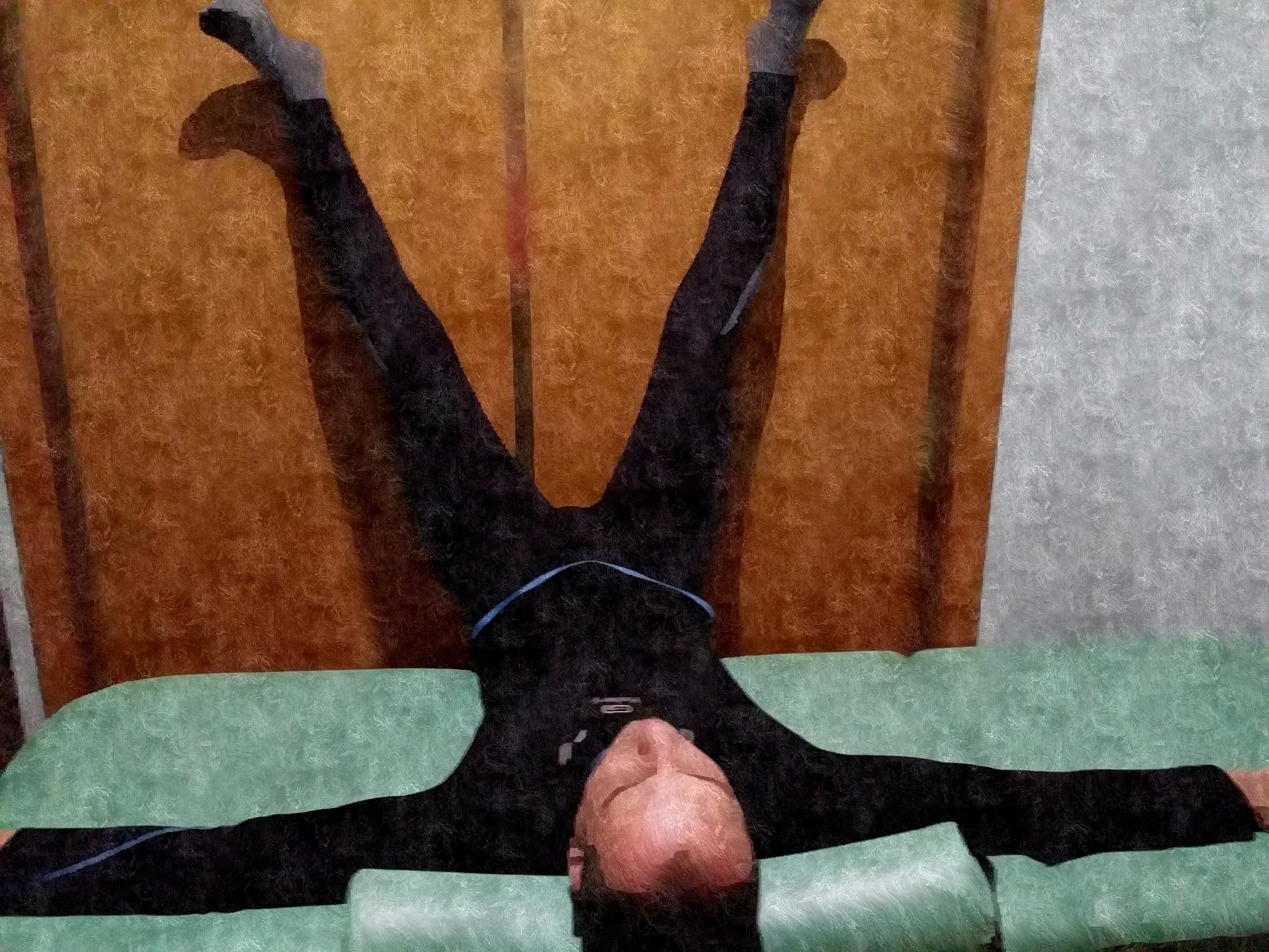 Tumbados de cubito supino con los pies elevados separados a la anchura de los hombros mas o menos, apoyándolos en la pared separandonos unos 45 grados de la misma comprobando que nuestro sacro este bien apoyado en el suelo, extendemos los brazos en cruz con las palmas de las manos hacia el suelo y nos ponemos un cojín bajo la cabeza, podremos intentar apuntar con los dedos gordos del pie hacia nuestra nariz osea realizar una flexión dorsal del pie esto aumentara la tensión de toda la cadena posterior
