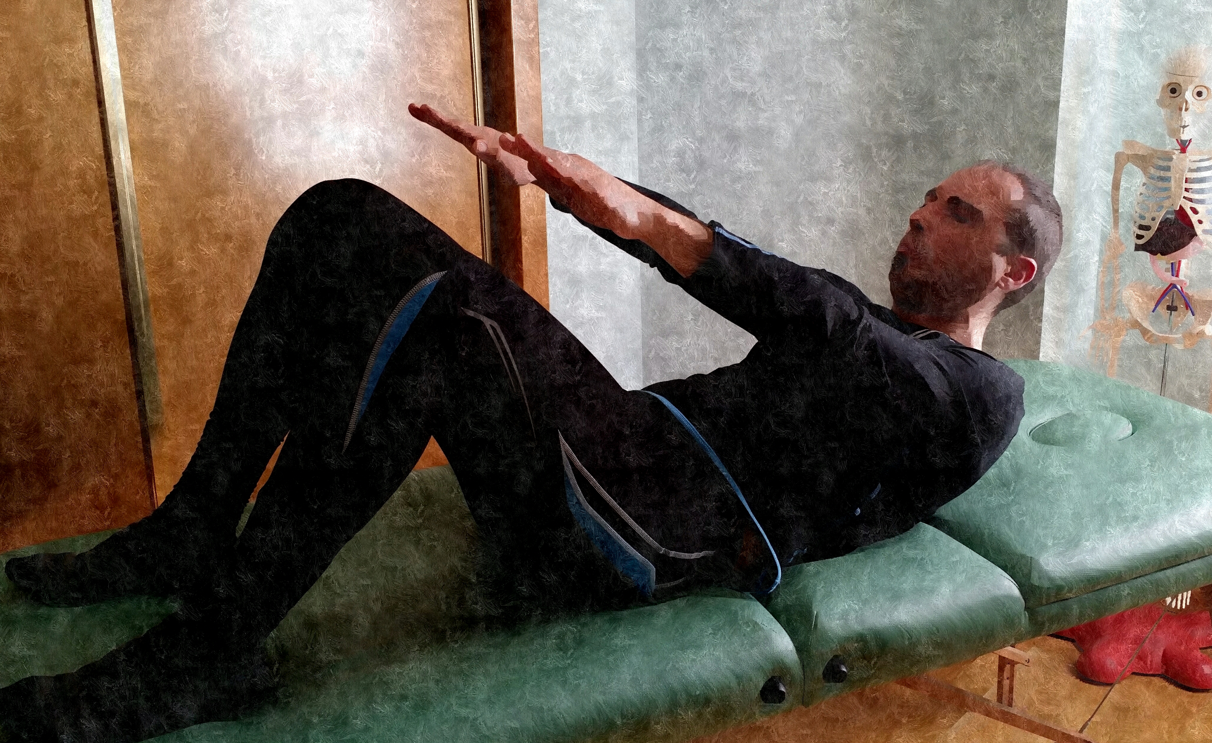 comenzaremos a flexionar el tronco lentamente hasta que elevemos la parte inferior de las escapulas ( omoplatos ) de la camilla. Mantendremos la posición 3 segundos.Deberemos realizar 3 series de 10 repeticiones.